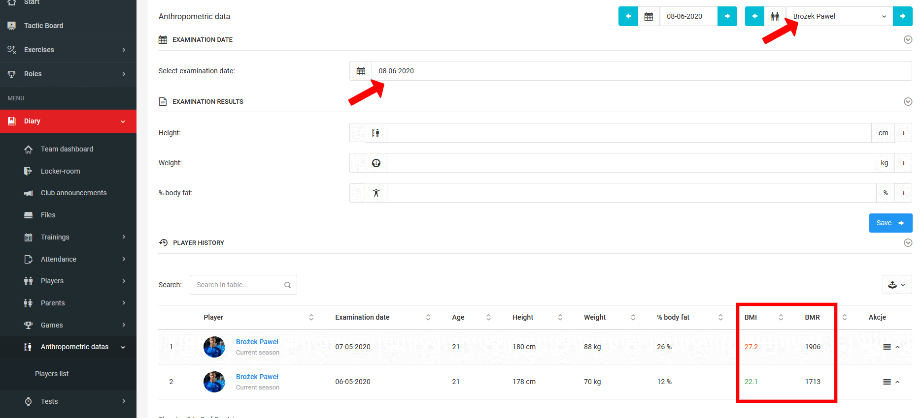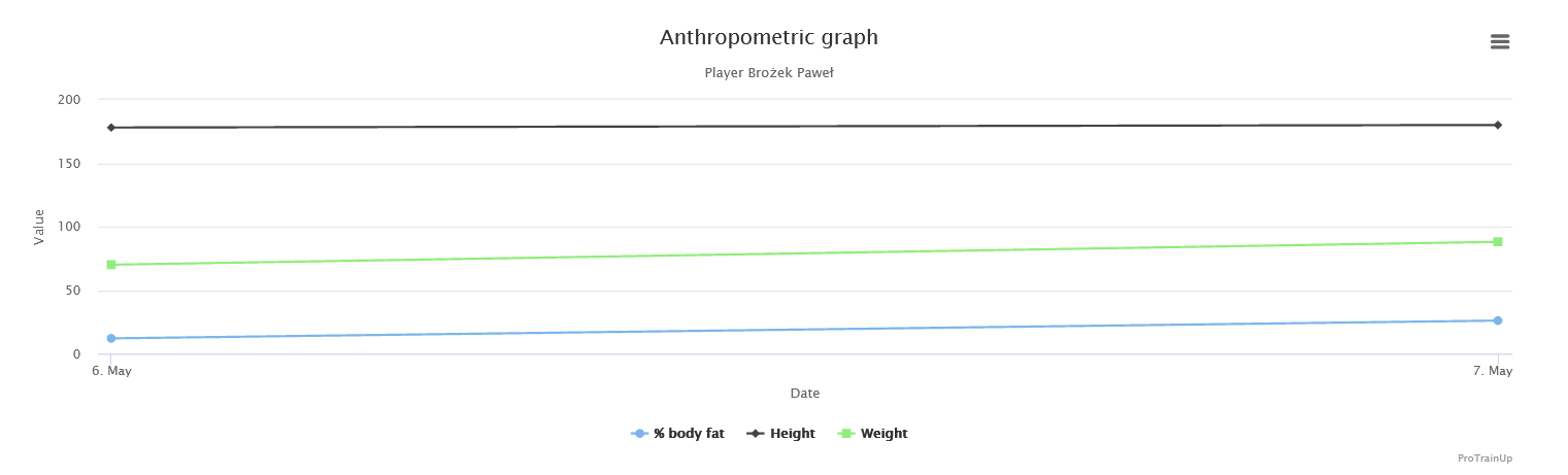 The first step before entering data is to select the date of measurement. Then you have three fields to complete: height, weight and percentage of body fat. Based on this data, gender and age of the player, BMI and BMR are calculated automatically. An important point is that this data follows the player through all the years of data entry and is presented as a line graph so that you are able to follow the physical development of the player over the years.