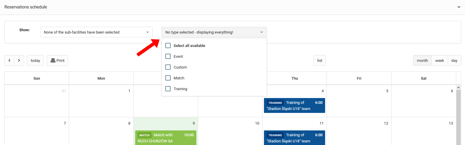 In the preview of each sub facility, at the bottom of the page, there is a timetable for reserving a given sub facility. Above the calendar, you have the possibility to filter a specific location and a specific type of event in order to increase the readability of the calendar in case of high occupancy.