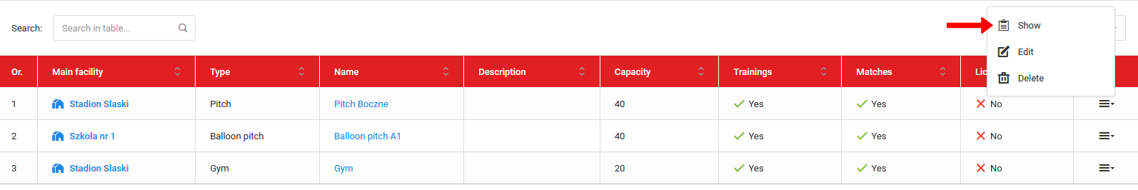 To view a given sub facility, go to the left menu club club facilities list of club sub facilities and select "preview" from the menu (last column) for the sub facility. From this menu you have the possibility to edit and delete a given sub facility.