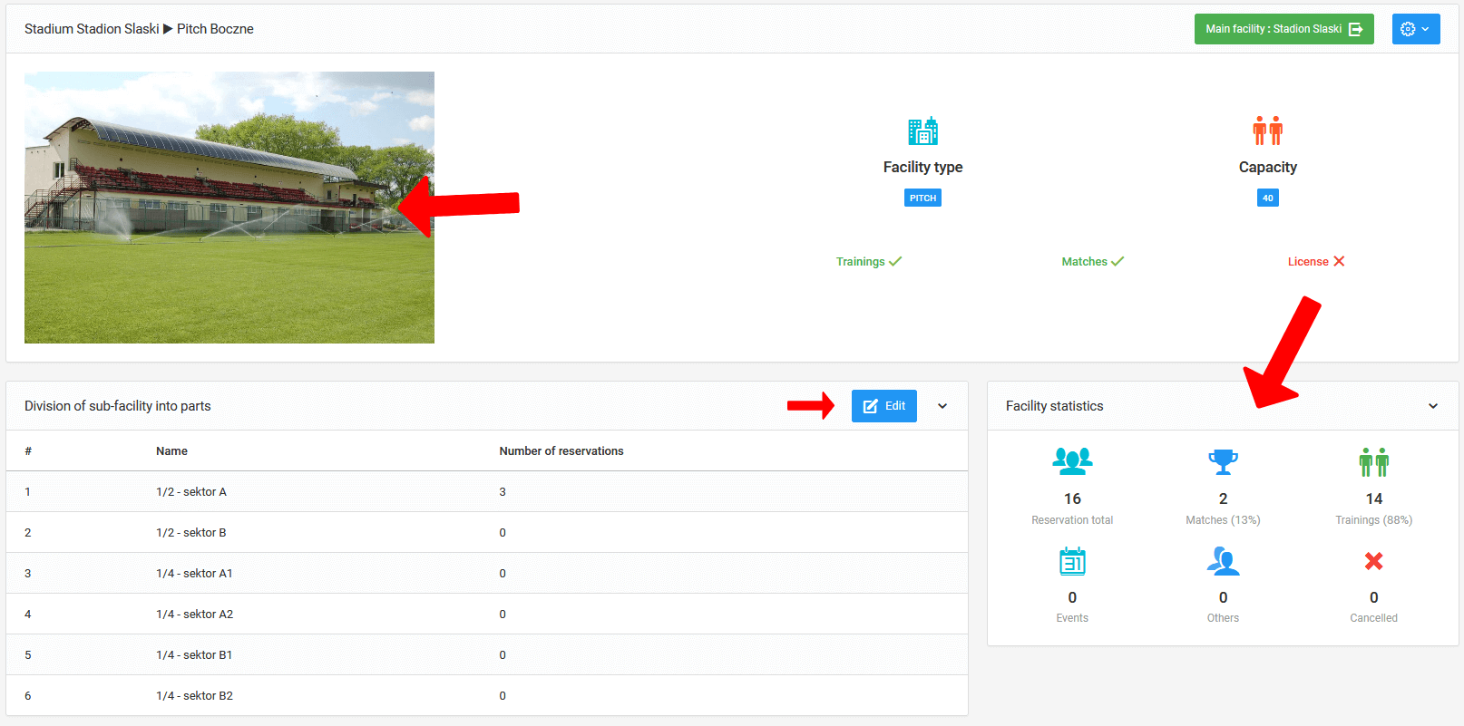 In the preview of a given sub facility you can see the most important information: contact data, photo and occupancy statistics. From here you also have the possibility to divide the sub facility, e.g. pitches into zones, which means that one pitch can be divided into two halves.