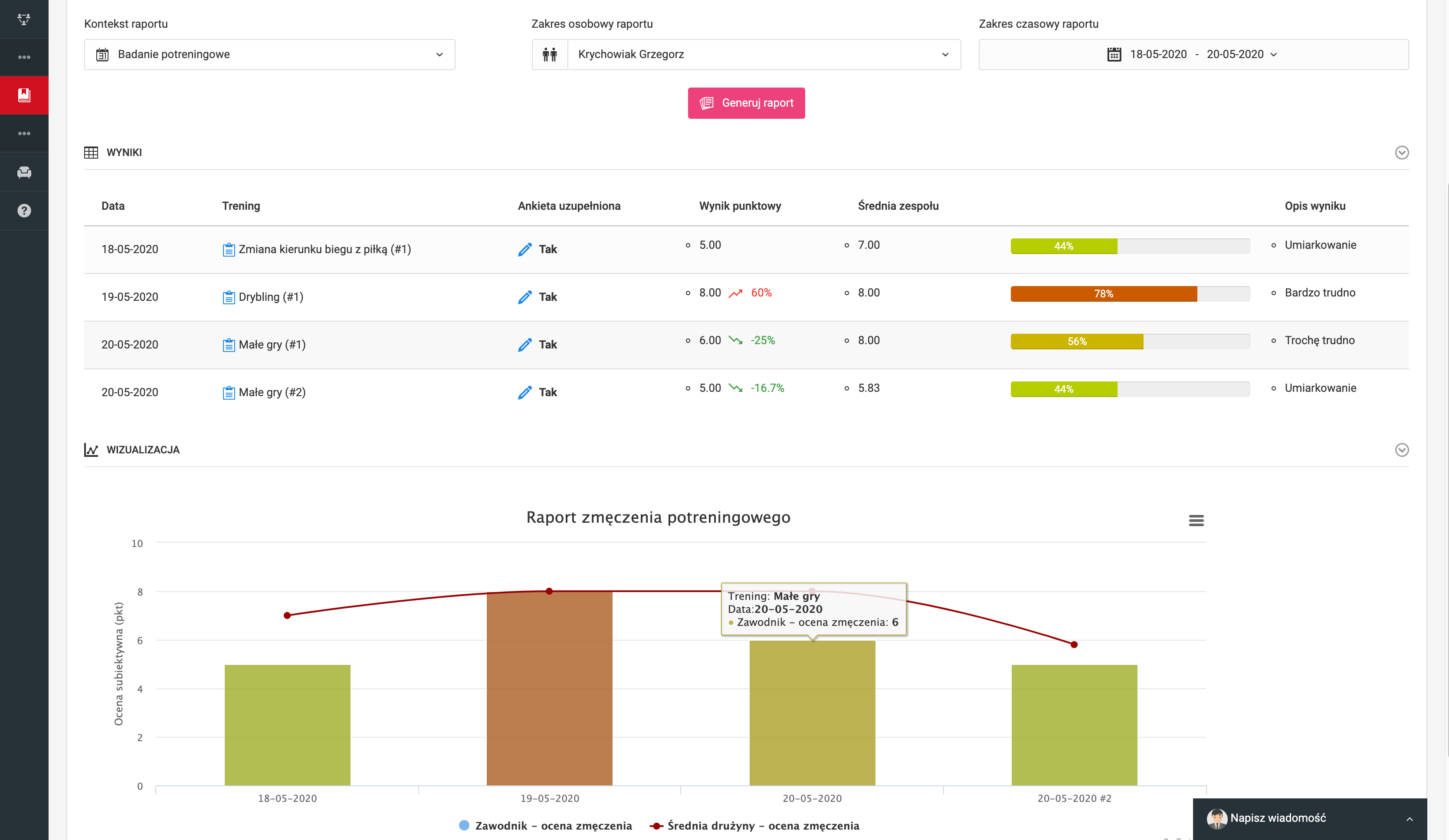 A summary report is also available in the system, showing a very wide range of data with analyses. Above the report table, there is a configurator available. As in the case of detailed reports, you can choose what type of studies should appear in the table. You can select which players are to be included in the report, mark the time range of the report and also hide days without measurements. On the right-hand side above the table, you have two sliders that affect the way data is presented. The first one is responsible for changing the way the results are calculated - you can choose a numerical or a percentage value. In the second slider, you determine whether the data is to be presented as a scale value or as calculated fatigue units (AU). Remember to confirm each change in the report configuration and analysis with the pink "generate report" button. The table itself contains several types of data. In the columns with the dates in the headers, you have the data about the specific results entered by the player. The columns can refer to daily, post-training and post-match tests. The columns behind the darker thicker line refer to the total, average and fatigue units (AU) of the players over the selected time period. In the lines below the darker-thick line, we have summaries of the results of each test for the whole team. The colors used in the table correspond to the colors that the players have to choose when completing the survey. Green - light fatigue, dark red - maximum fatigue.