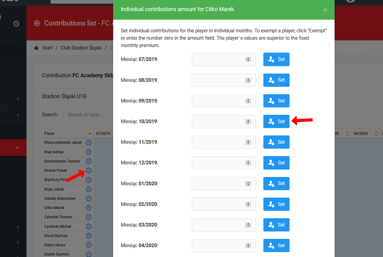 The system allows you to set individual contribution amounts for each player in your club. To do this, go to the left menu club contributions list and click on the contribution you're interested in. After clicking on the name of the contribution, you will be taken to the contribution table view, where you will see the list of players in the first column. There is a blue icon next to each player's name. When you click on the icon, a contribution individualisation window appears.