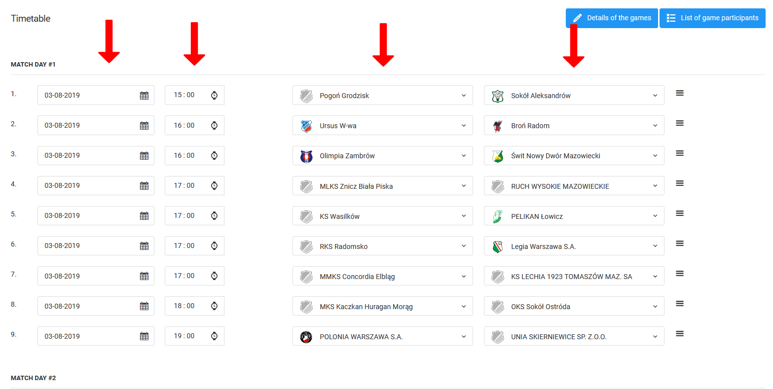 The last stage of the creation of the games is the listing of match pairs, in each round of the game. You can either do it once, go or divide it into stages. You have four elements to set: date, time, host and guest team for each match. It is convenient to arrange the participants of a match because the once chosen team cannot be chosen again within one round of matches. This way you will avoid making a mistake when scheduling matches.
