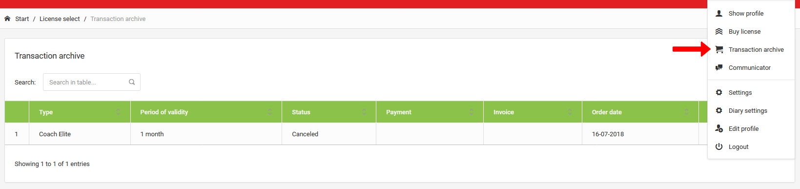 For individual payments you have access to the archive of all your transactions. To access the archive, click on your name in the right corner of the screen, then select "transaction archive" from the menu.