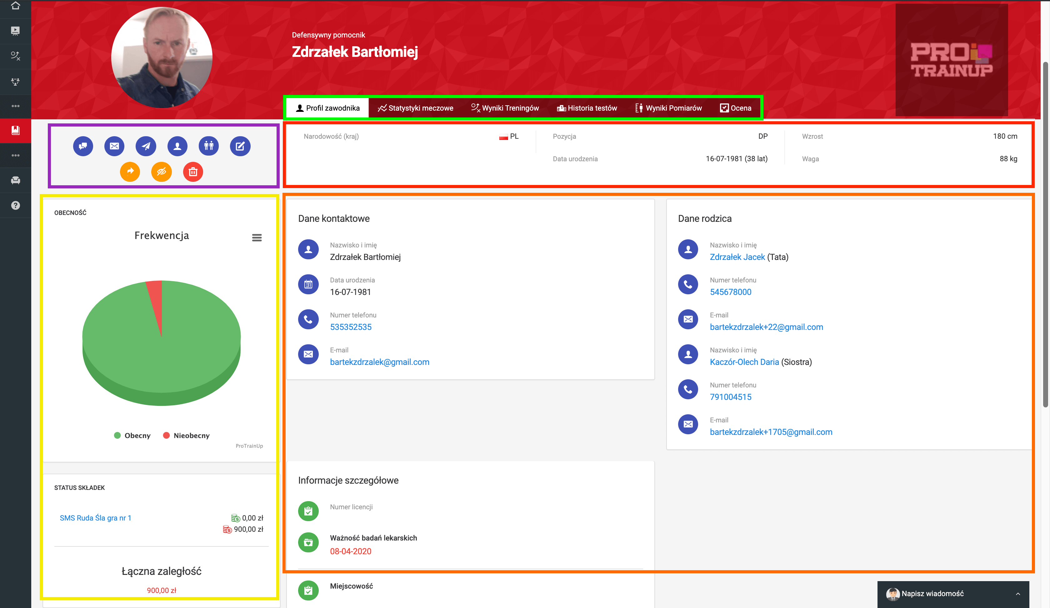 A player's profile consists of several sections, which are color-coded in the picture above. Green is a list of bookmarks, which can be clicked on to go to the corresponding section of the player's profile. Violet is the function menu, which allows you to run actions such as editing the profile, deleting the profile, hiding the player, sending him a private message or e-mail. Red is the section that shows the player's metric and anthropometric data. Yellow is the section with information about attendance and contribution notes. Orange is the section containing personal data of the player and his parents.