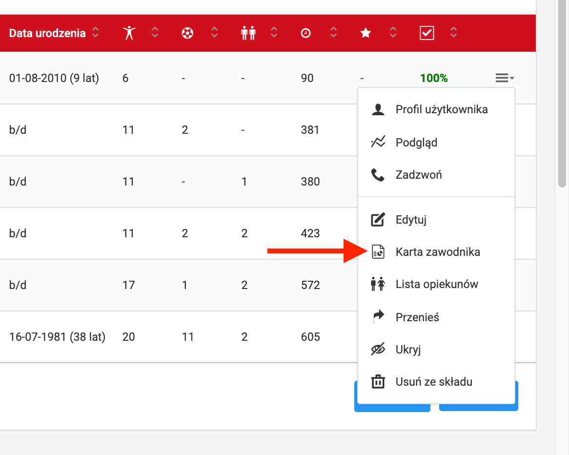 Each player in the system has an automatically generated profile and a player card. Both these tabs collect the most important data about the player in selected season. To go to the player's profile, you have to enter the player list and click on the name of the player.