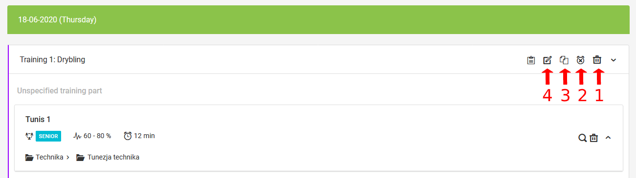 Above each training session, in the top right corner, there are additional options that you can use at any time. The first (1) is to delete the training completely, the second (2) is to cancel the training. By clicking on this icon a pop-up will appear where you can specify the reason for cancelling the training and check the option to send a notification to participants. The third position (3) is to copy the training. This will allow you to copy the training not only from day to day but also between the teams you are leading. The fourth (4) icon opens the training editing window.