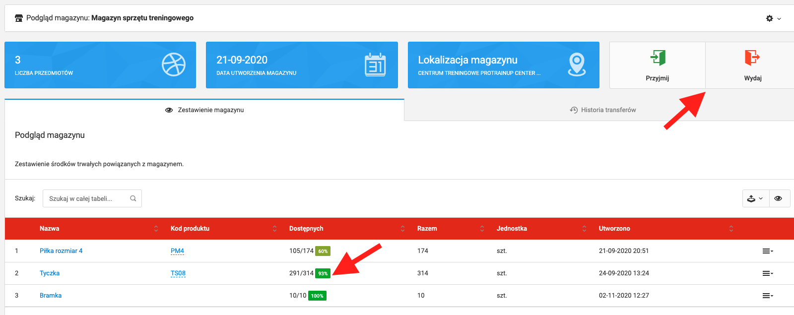 To see the preview of the warehouse, press its name on the warehouse list. Then you will see a table with all added equipment and items added to the warehouse. The table also shows information on the number of items available.