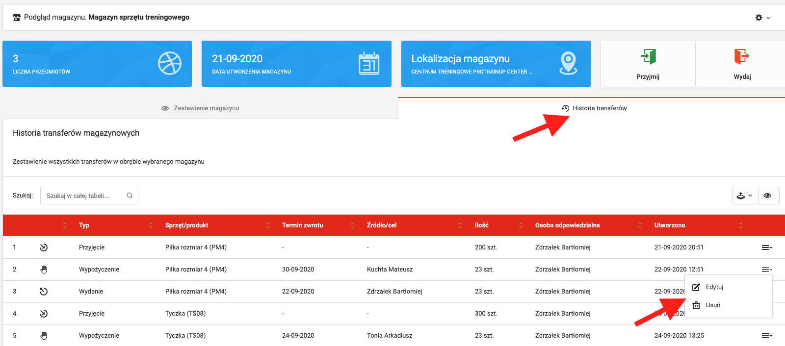 The transfers history table shows all actions regarding equipment in the selected warehouse. Each transfer can be edited or deleted, to do that, press the button located in the far right column and choose one of the options.